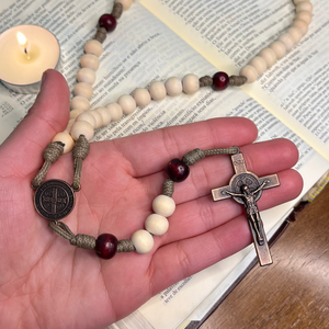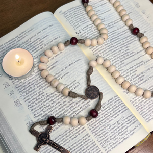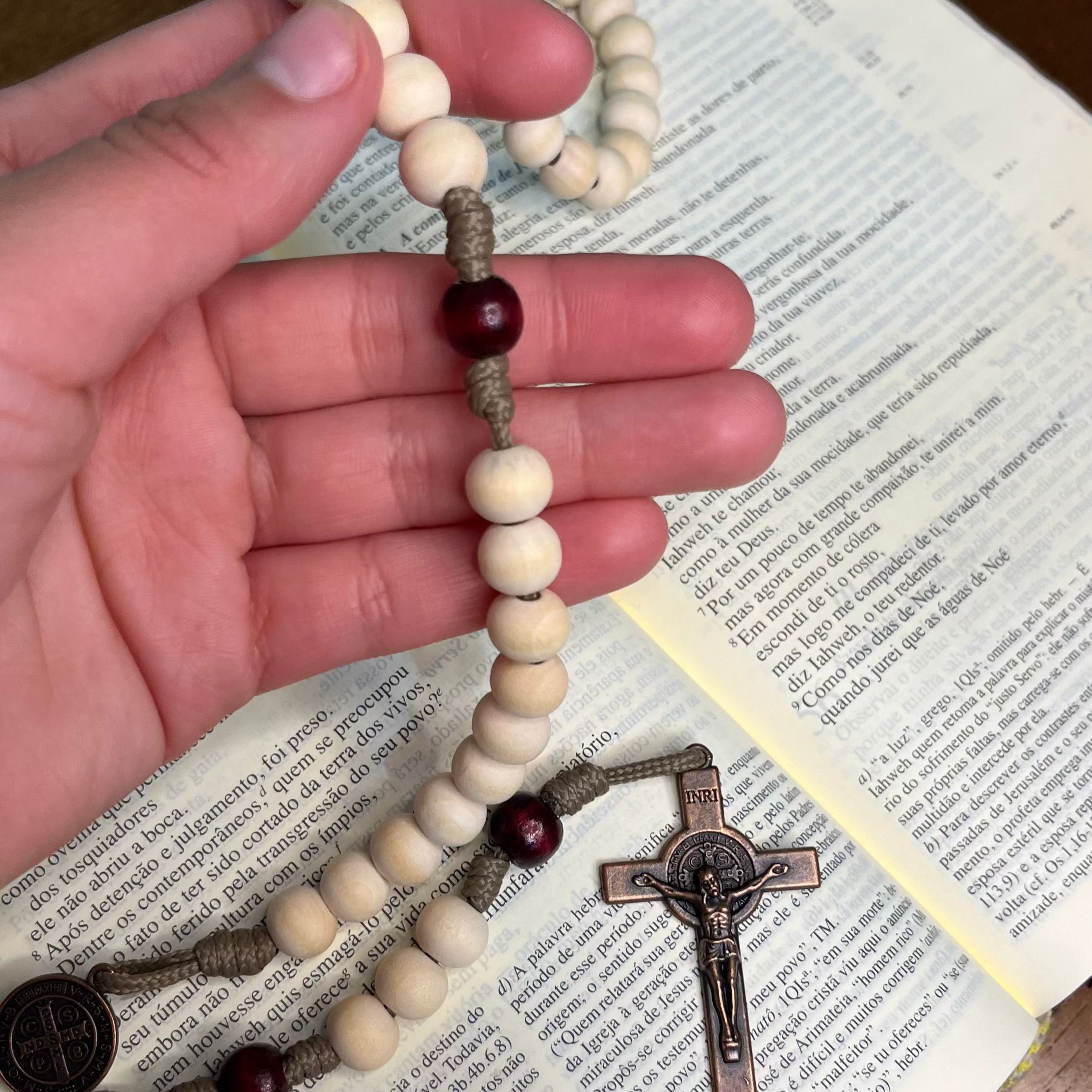 Um terço que une a pureza do branco com a força do vermelho, representando a fé sólida e inabalável de quem confia na proteção divina. Suas contas em madeira natural branca, intercaladas com contas Pai-Nosso em vermelho profundo, simbolizam a luz de Cristo e o sangue derramado por amor à humanidade.